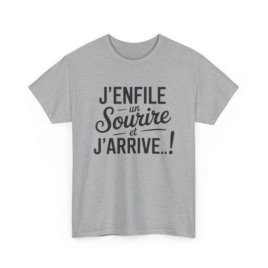 Tee-Shirt Humour Français Unisexe – “J’enfile un Sourire et J’arrive” – T-Shirt Positif Homme Femme Blanc Gris Coton S à 3XL