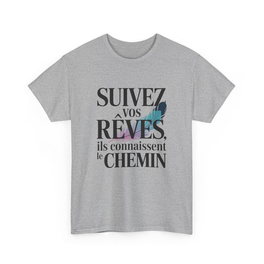 Tee-Shirt Unisexe Inspirant – “Suivez Vos Rêves” – Citation Positive avec Plume – T-Shirt Blanc ou Gris S à 3XL