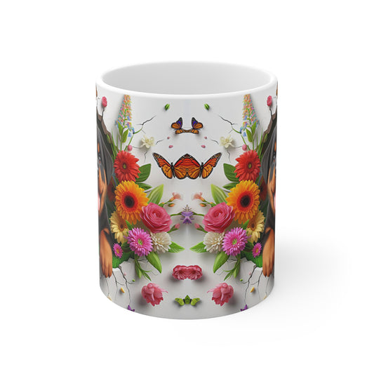 Tasse Céramique Rottweiler et Fleurs – Mug Chien Mignon Papillons – Cadeau Animaux Bohème 325ml