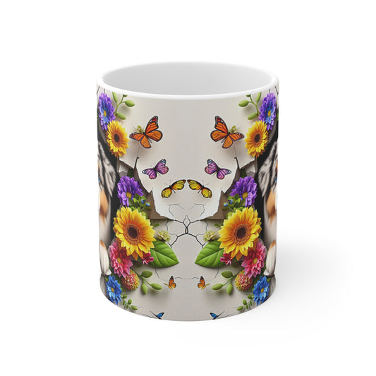 Tasse Céramique Berger Australien et Fleurs – Mug Chien Mignon Papillons – Cadeau Animaux Bohème 325ml