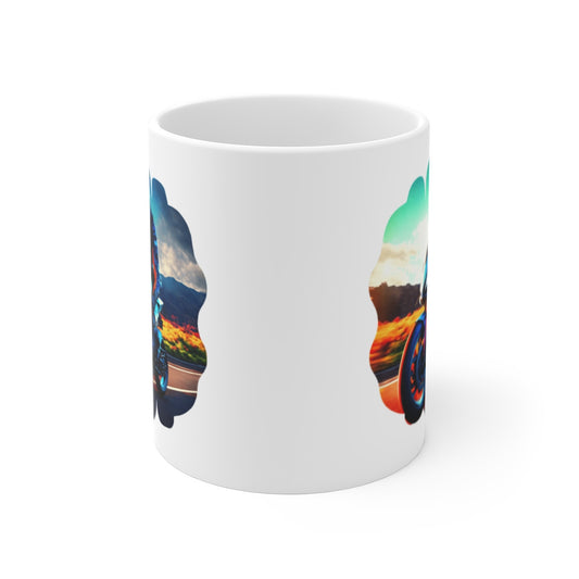 Mug Moto Sport – Design Motard Carénée sur Route Montagneuse – Photo Réaliste Haute Vitesse