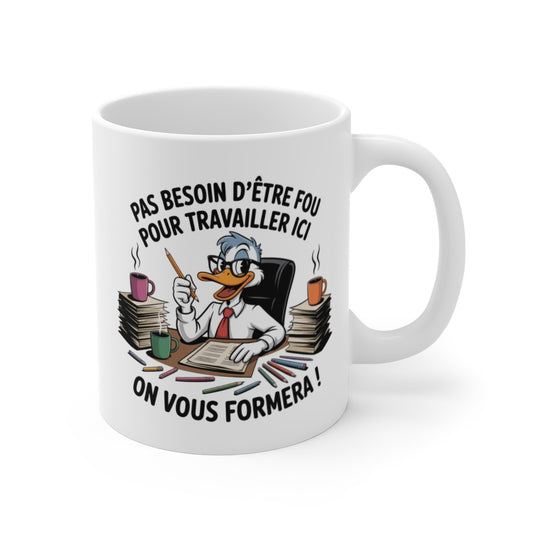 Mug Humour Travail Canard de Bureau Pas Besoin d’être Fou, On Vous Formera Cadeau Collègue, Bureau, Employé, DRH