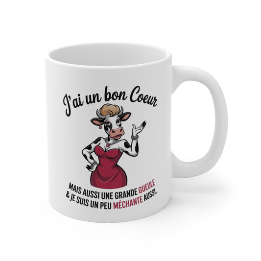 Mug Femme Attitude J’ai un Bon Cœur, Une Grande Gueule & Je Suis un Peu Méchante Vache Stylée Humoristique