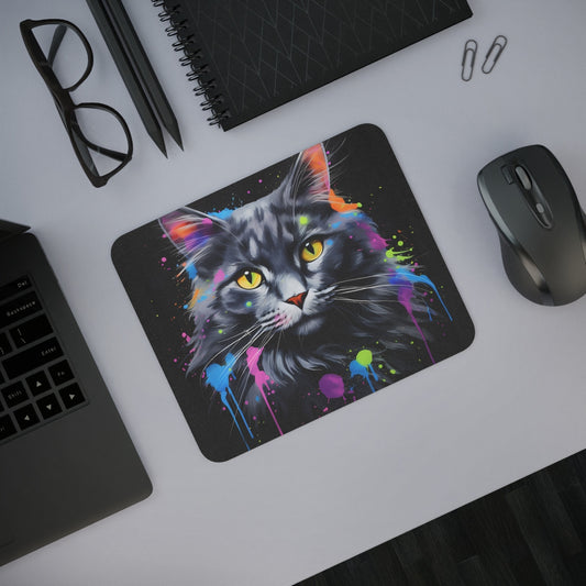 Tapis de Souris Chat Élégant Portrait de Chat Gris Style Peinture Splash Colorée Idée cadeau
