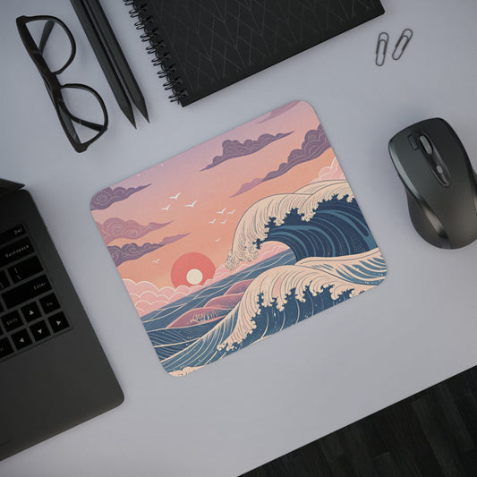 Tapis de Souris Vague Japonaise Stylisée Design Océan, Soleil Couchant, Nuages Roses
