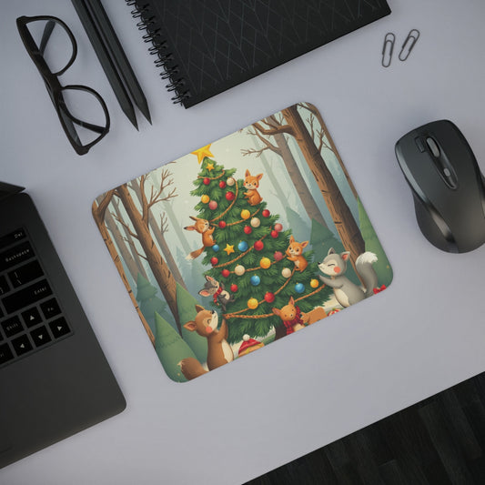 Tapis de Souris de Noël Forêt Enchantée Animaux Mignons, Sapin Décoré, Ambiance Hivernale Magique