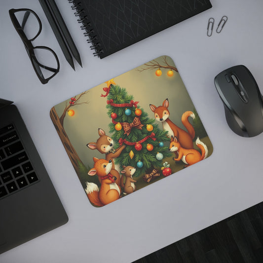 Tapis de Souris Noël Forêt Animaux Mignons Cerf, Renards, Faons et Sapin Décoré Accessoire Bureau Enfant ou Adulte