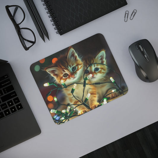 Tapis de Souris Noël Chaton Deux Chatons avec Guirlande Lumineuse Accessoire de Bureau Hiver Cadeau Mignon et Festif