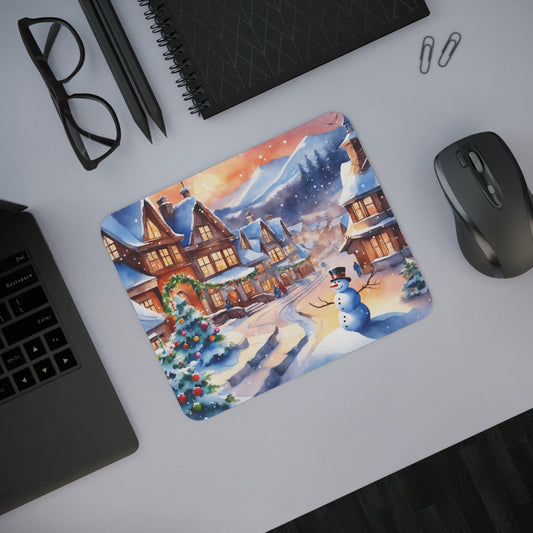 Tapis de Souris Bonhomme de Neige Scène de Village de Noël Enneigé, Illustration Hivernale Féérique