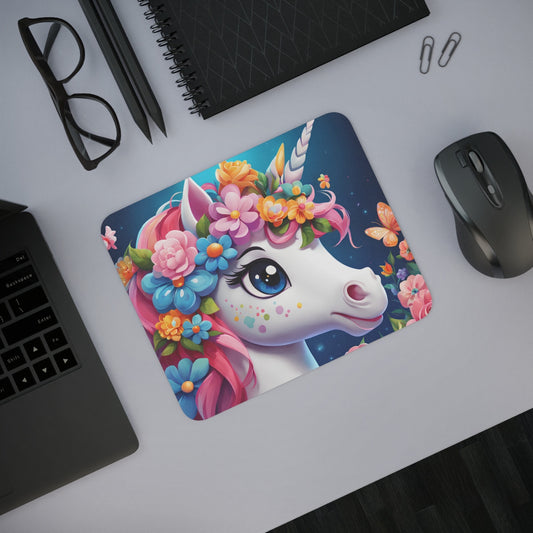 Tapis de Souris Licorne Féérique Portrait Licorne aux Yeux Bleus et Fleurs Magiques
