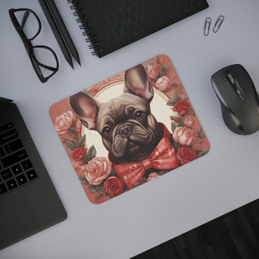 Tapis de Souris Bouledogue Élégant – Nœud Papillon Rouge et Roses Vintage Accessoire Bureau Classy et Animalier