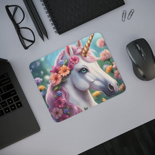 Tapis de Souris Licorne Fleurie Féérique Crinière Rose et Corne Dorée Accessoire Bureau Magique et Coloré
