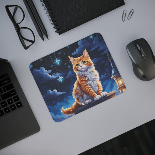 Tapis de Souris Chat Roux Magique Illustration Nocturne Féérique Ciel Étoilé, Lanterne et Éclat Lunaire Accessoire Bureau