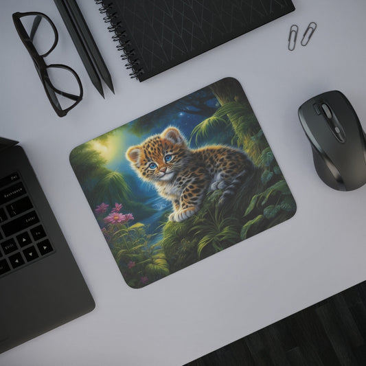 Tapis de souris bébé léopard aux yeux bleus Tapis 22x18 cm doux et antidérapant Ambiance féerique pour bureau ou gaming