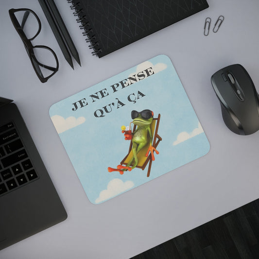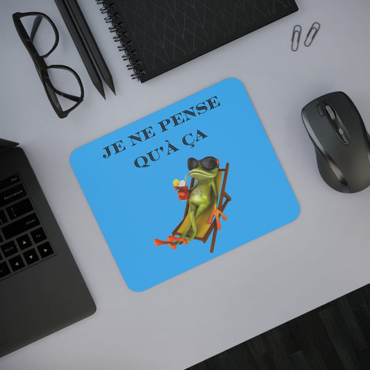 Tapis de souris humour grenouille vacances – "Je ne pense qu’à ça" – Version fond bleu