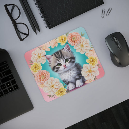 Tapis de souris 22x18 cm – Chaton Kawaii & Fleurs Pastel