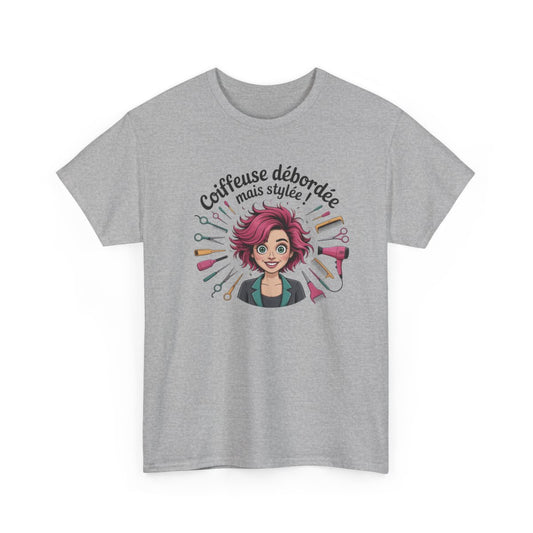 T-shirt Coiffeuse Débordée mais Stylée Tee Shirt Femme Métier Humoristique Blanc ou Gris Illustration Colorée