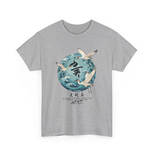 T-shirt Japon Grue & Vagues Unisexe – Tee-shirt Estampe Japonaise Tradition – Blanc ou Gris – Design Océan Culture Asie