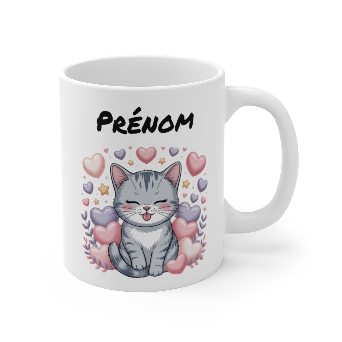 Mug Chat Kawaii Personnalisé Prénom – Tasse Café 11oz Céramique Cadeau Mignon Fille Ado