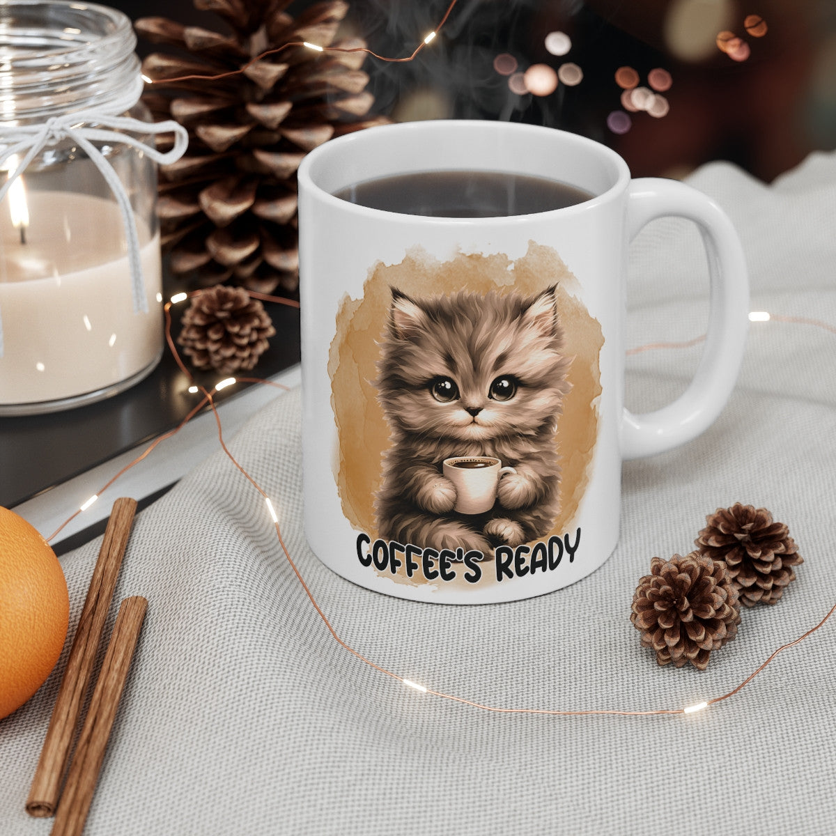 Mug "Coffee's Ready" avec Chat – Tasse Céramique 325ml – Cadeau Amusant pour Amoureux des Chats et du Café