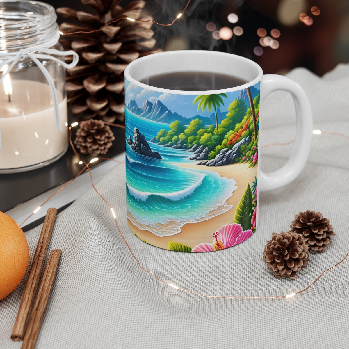 Mug Paysage Plage Tropicale  Tasse Exotique Océan, Palmiers & Fleurs Colorées, Idéal Vacances & Nature
