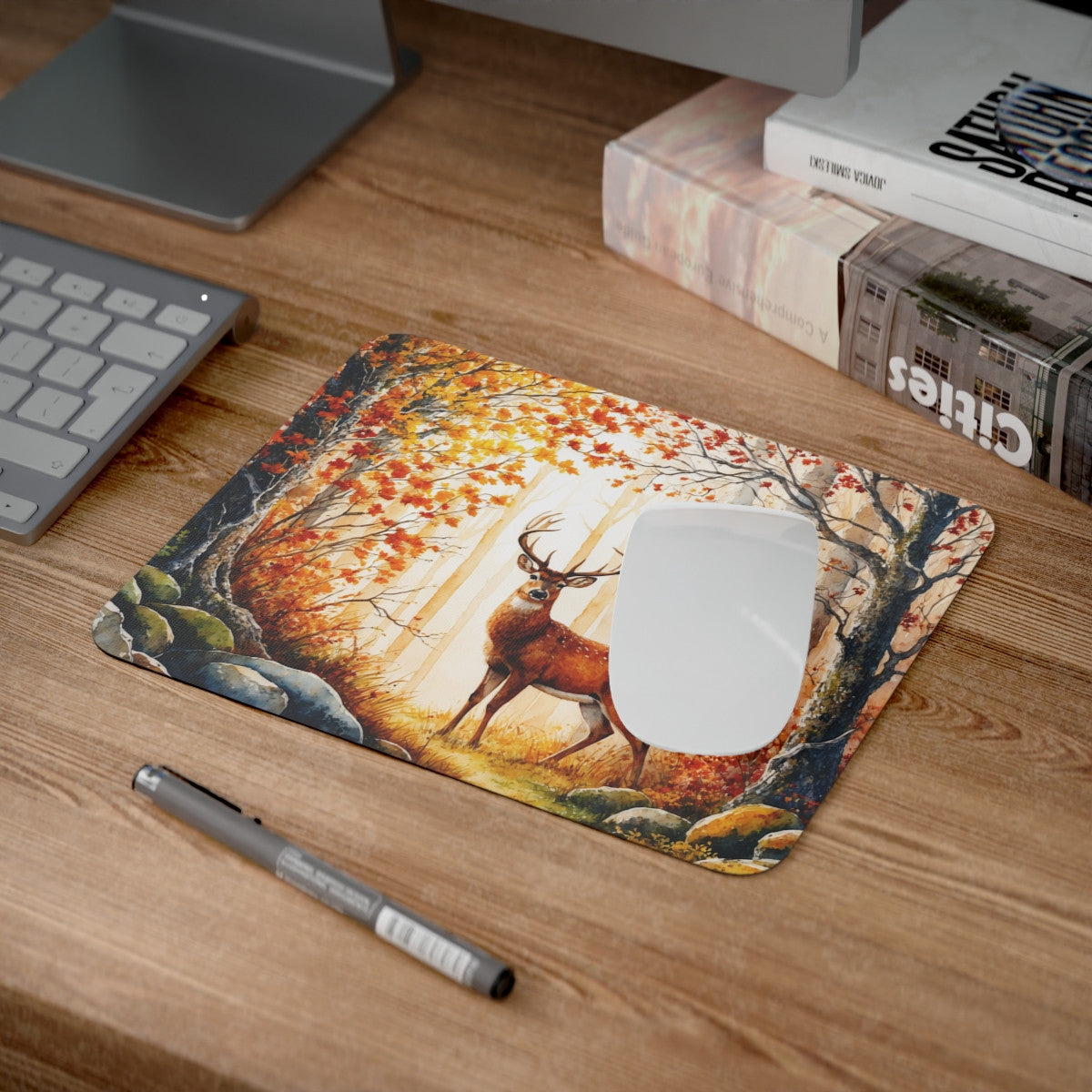 Tapis de souris 22x18 cm – Cerf Majestueux en Forêt d’Automne Illustration Aquarelle Nature – Surface Lisse, Base Antidérapante