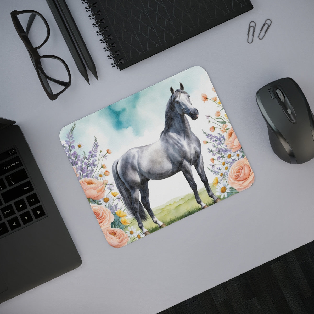 Tapis de souris 22x18 cm – Cheval Gris & Fleurs Printanières