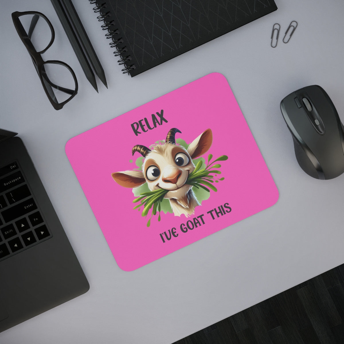 Tapis de souris 22x18 cm – Chèvre Kawaii & Jeu de Mots « Relax, I've Goat This » – Fond Rose