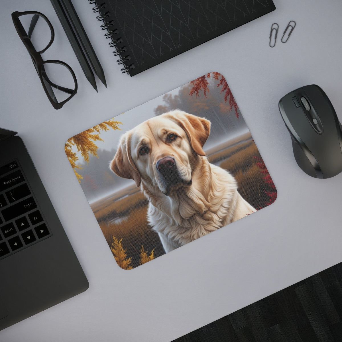 Tapis de souris 22x18 cm – Labrador Sable en Paysage Brumeux – Illustration Automnale