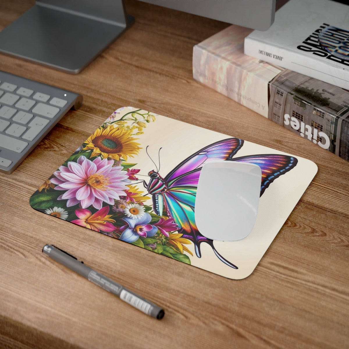 Tapis de souris 22x18 cm Papillon Arc-en-Ciel & Fleurs Illustration Florale Colorée Surface Lisse, Base Antidérapante