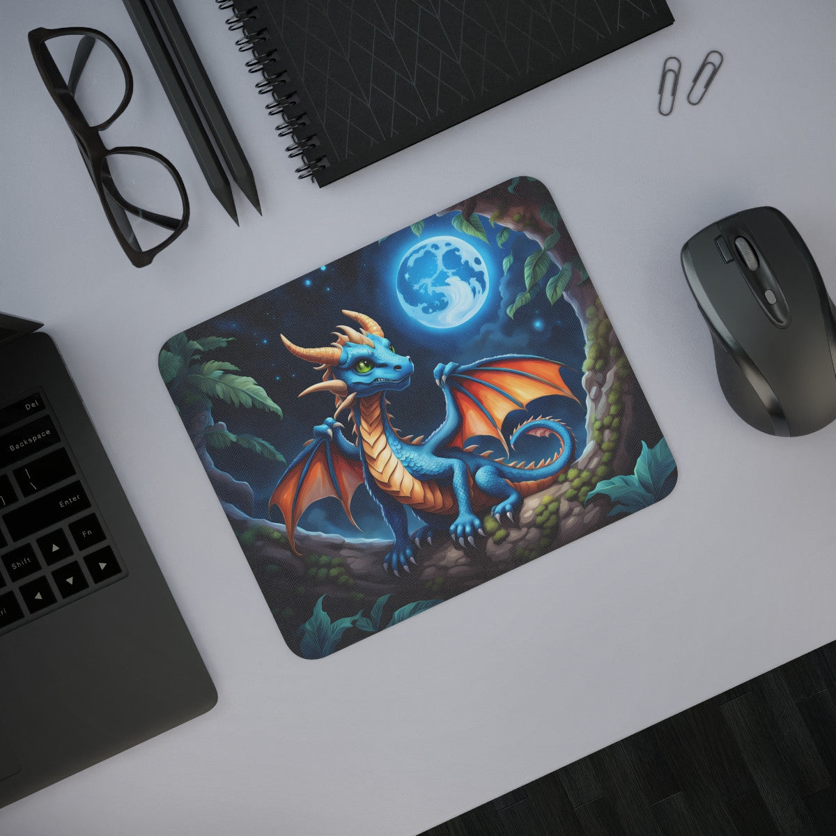 Tapis de Souris Bébé Dragon Bleu Créature Fantastique sous la Lune Design Magique et Mystique