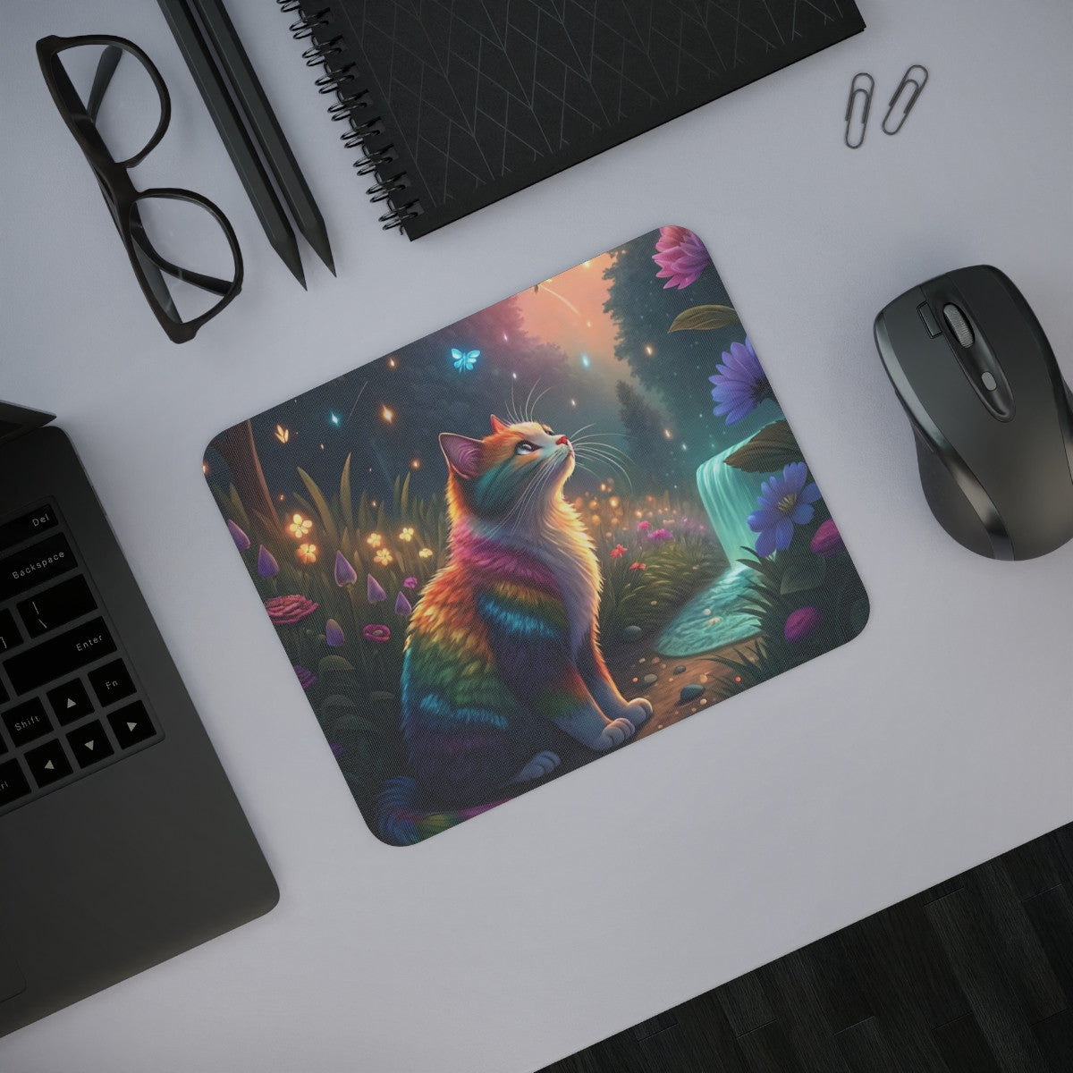 Tapis de Souris Chat Arc-en-Ciel Fantastique Coloré dans Forêt Enchantée avec Papillons, Cascade et Fleurs
