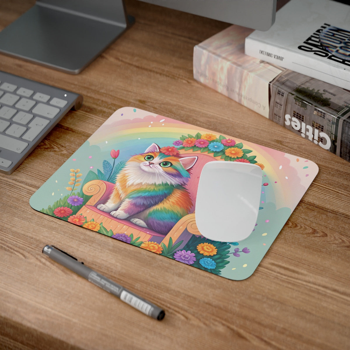 Tapis de Souris Chat Arc-en-Ciel Mignon – Chaton Coloré sur Trône Fleuri et Arc-en-Ciel