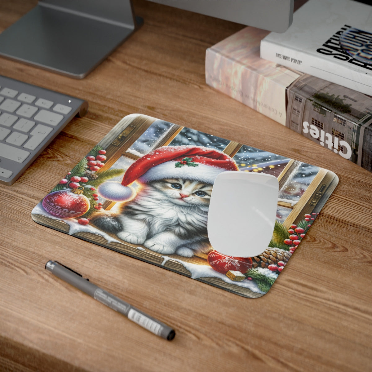 Tapis de Souris Chat de Noël Cozy Chaton avec Bonnet Rouge, Houx et Décor Hivernal