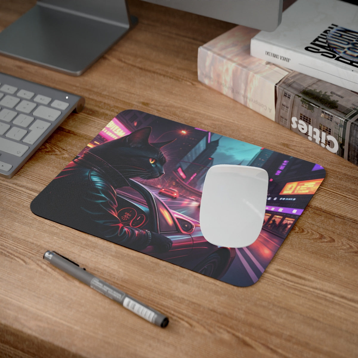 Tapis de Souris Chat Noir Cyberpunk – Chat Cool en Blouson de Cuir au Volant, Ambiance Néon Ville Futuriste