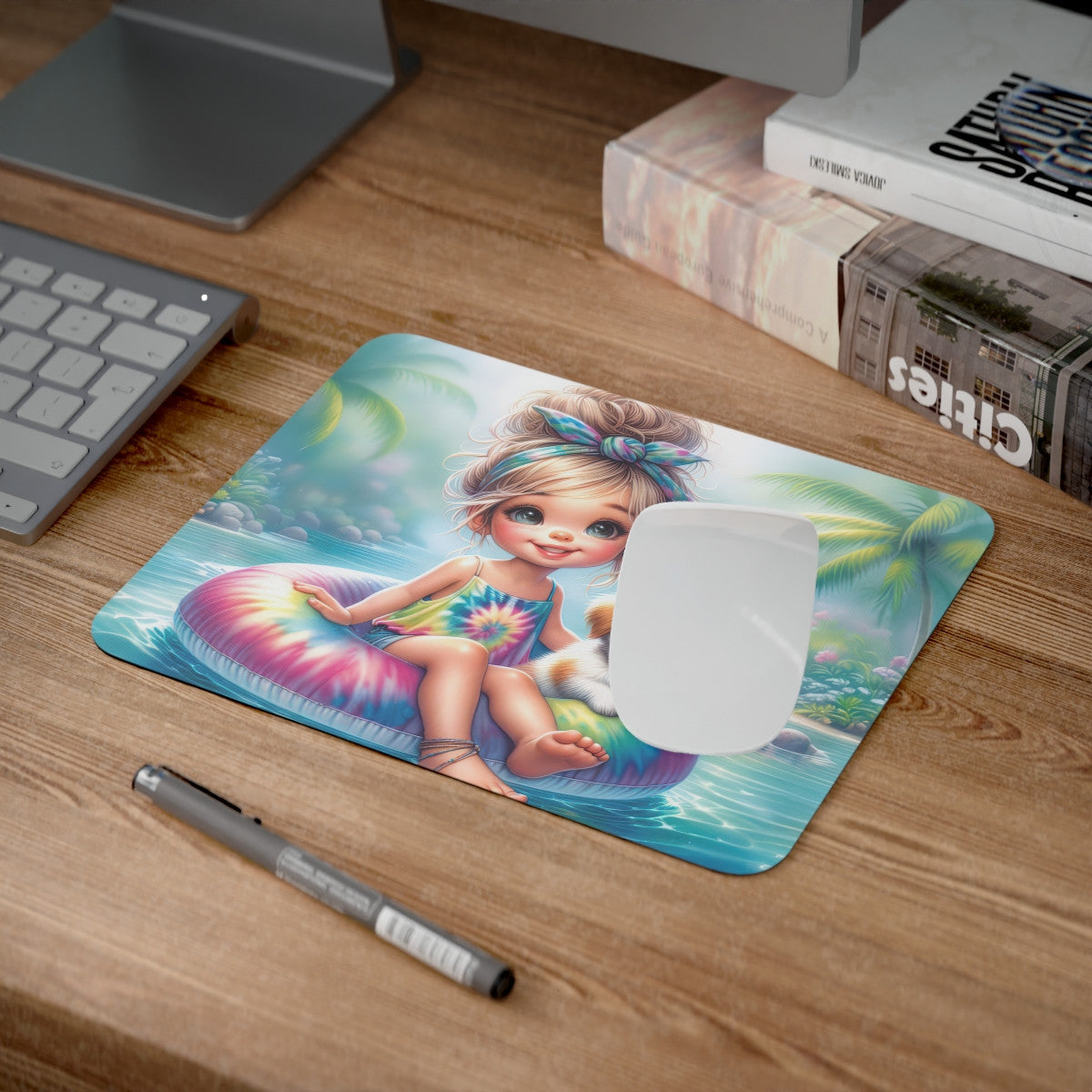 Tapis de Souris Été Kawaii Petite Fille et Chien avec Lunettes sur Bouée