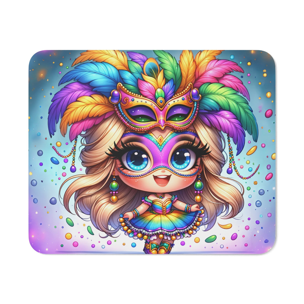 Tapis de Souris Fille Carnaval  Illustration Colorée et Festive Masque, Plumes, Confettis Accessoire Bureau Fun et Créatif