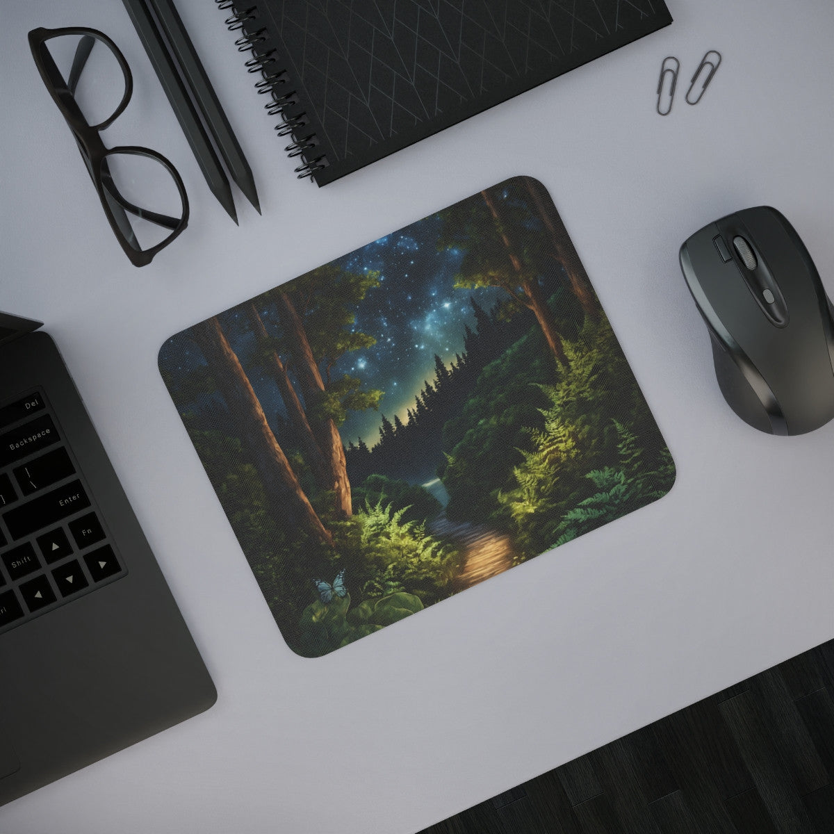 Tapis de Souris Forêt Étoilée Nocturne sous le Ciel Galactique Illustration Nature Féérique Accessoire Bureau