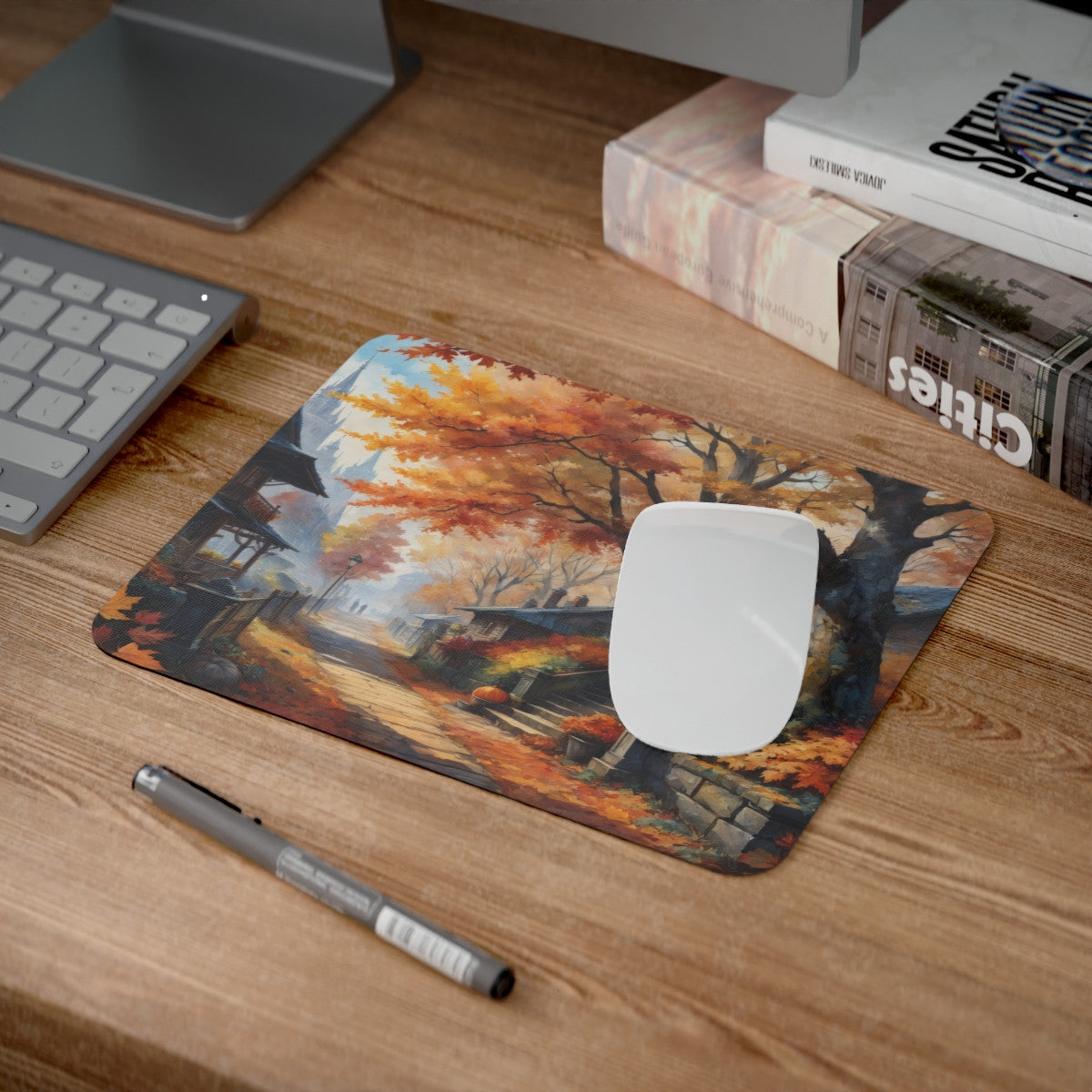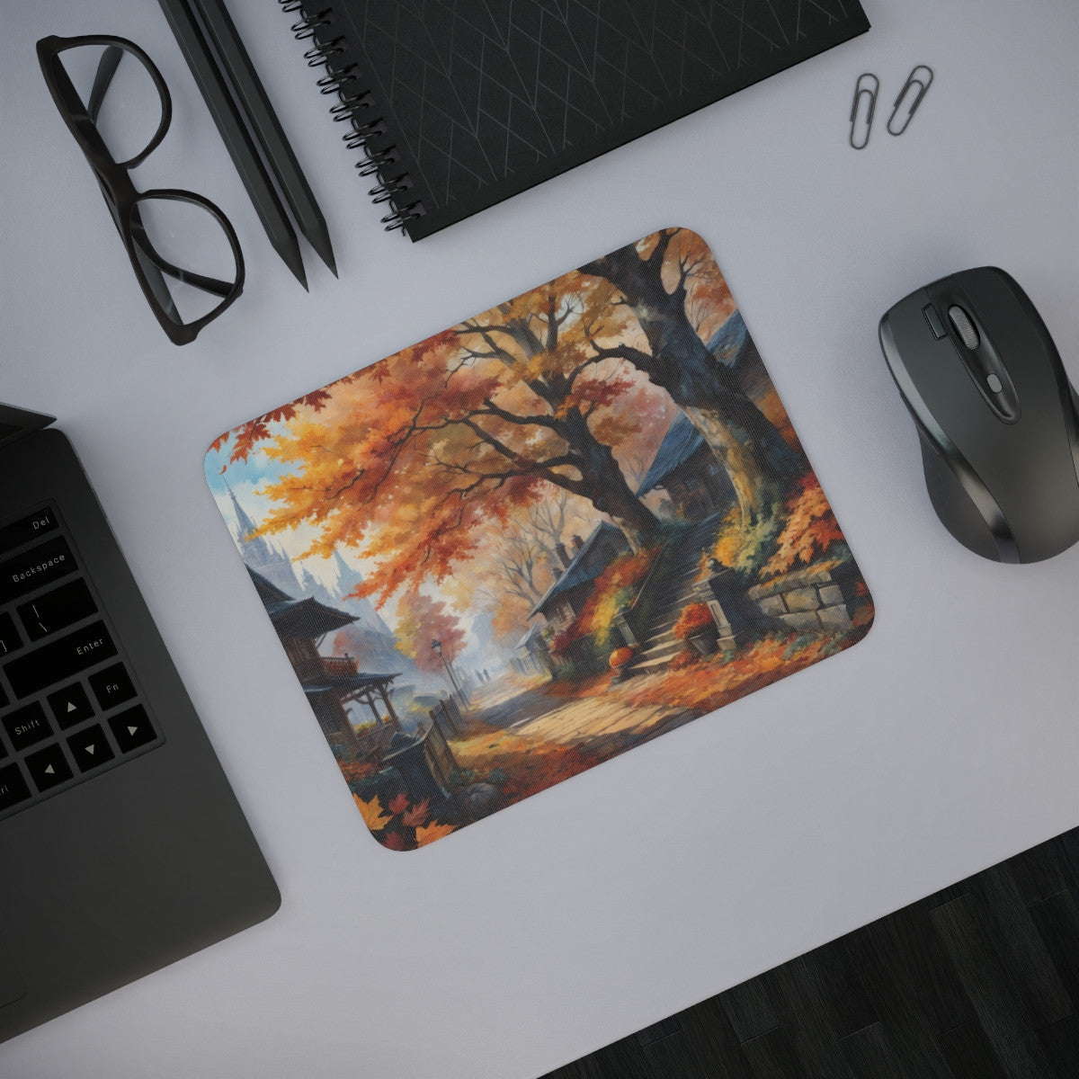 Tapis de Souris Paysage d’Automne  Village Enchanté, Feuilles Rouges et Maisons de Charme Idée cadeau