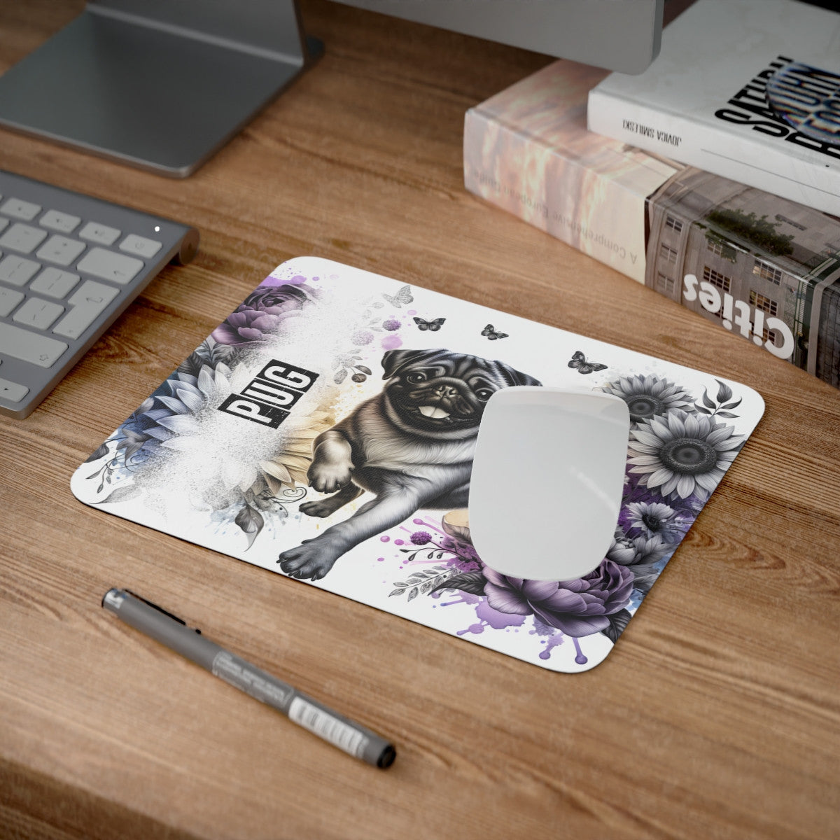 Tapis de Souris Pug (Carlin) Artistique – Petit Chien Marrant Illustré avec Fleurs Noires & Violettes