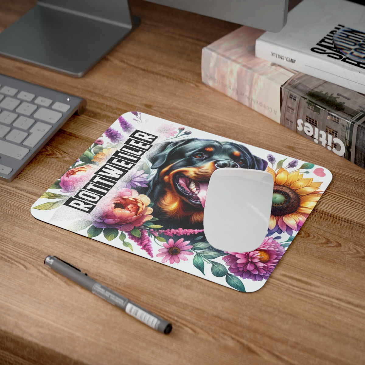Tapis de Souris Rottweiler Artistique avec Fleurs Chien Noir & Feu Joyeux Illustré sur Fond Floral Coloré