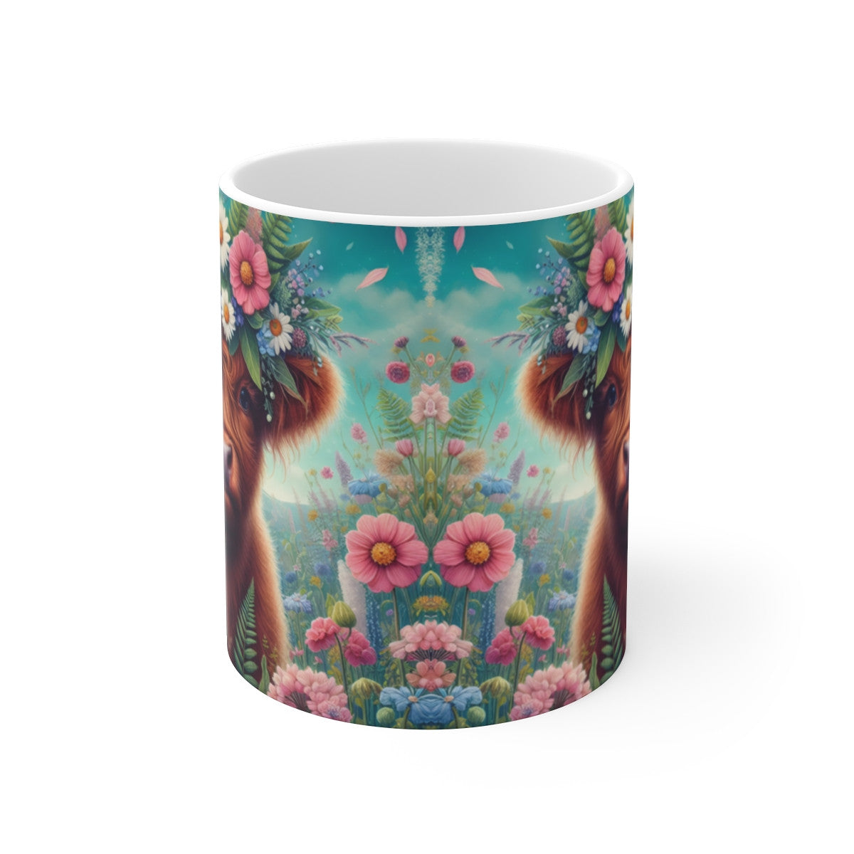 Tasse Vache Highland Couronne Fleurie – Mug Bohème Panoramique – Cadeau Ferme Nature Céramique 325ml