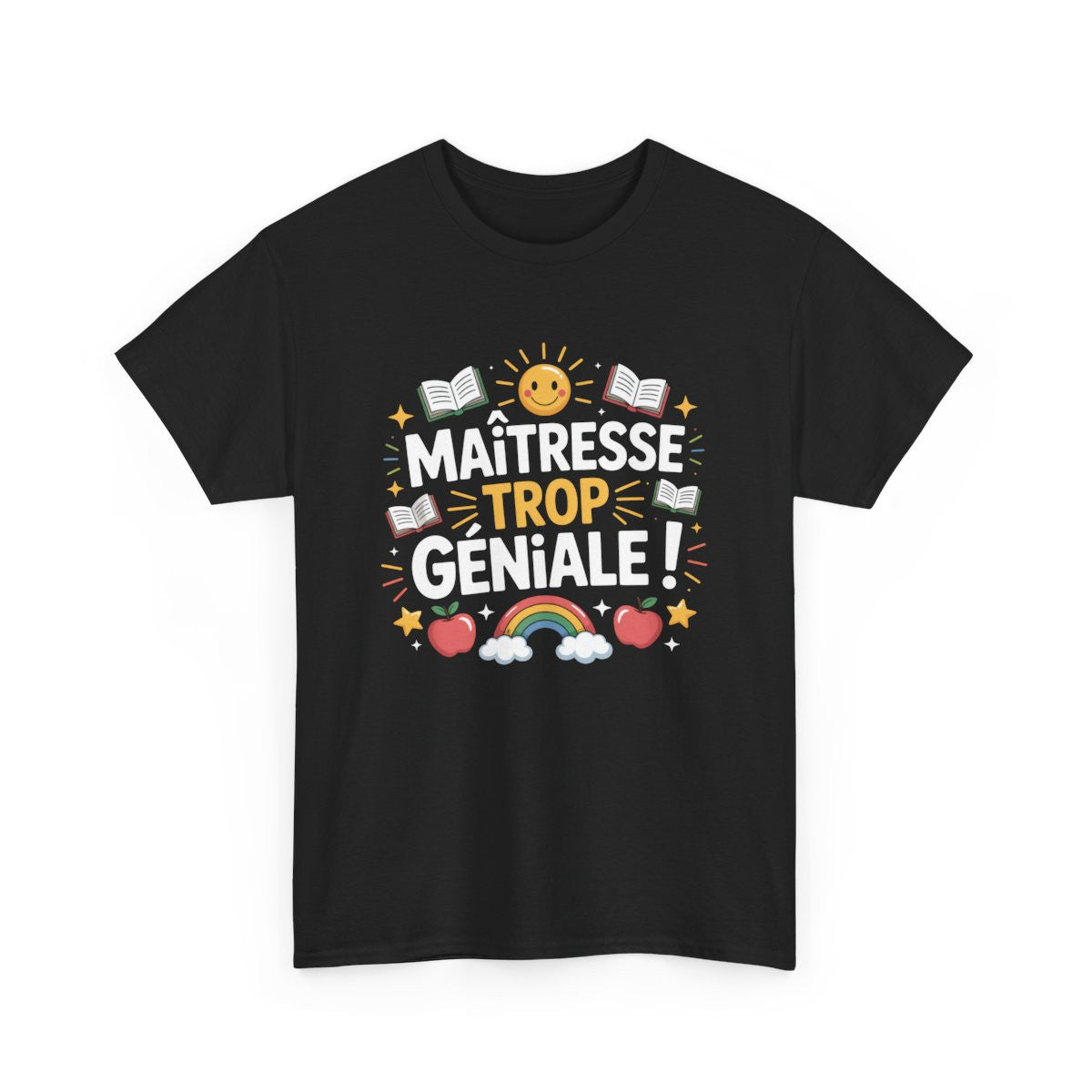Tee Shirt Maîtresse Noir – "Trop Géniale" – T-shirt Cadeau Fin d’Année École Primaire ou Maternelle S à 3XL
